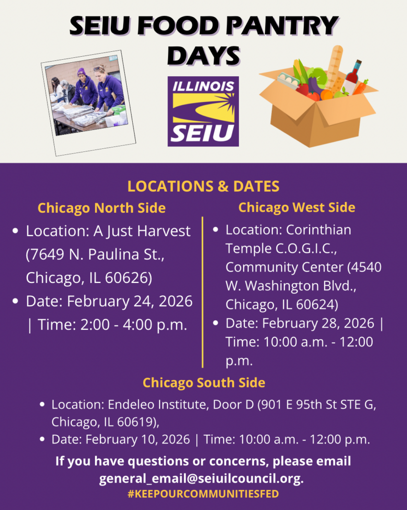We’re inviting our SEIU IL family to join us at an upcoming SEIU food pantry day in your neighborhood to collect food donations as we kick off 2026!